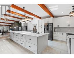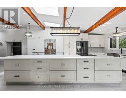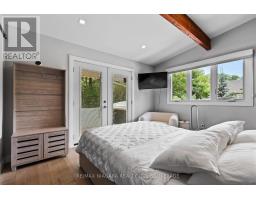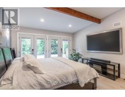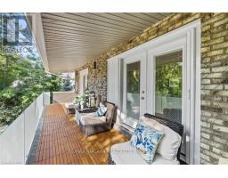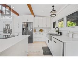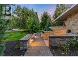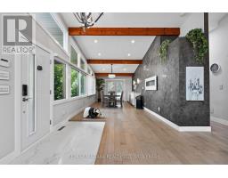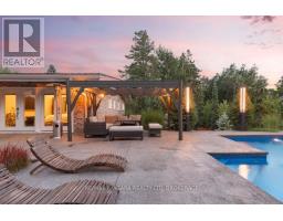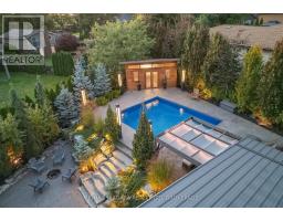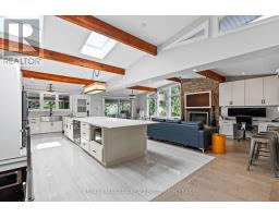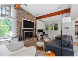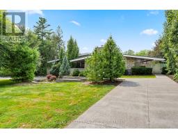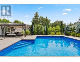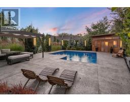 Estate style lot surrounded by mature trees in the gorgeous Bevan Heights location featuring 3 bedrooms with a potential 4th, 5 bathrooms, a Boldt saltwater heated pool, outdoor poolhouse with bathroom, metal roof, heated garage, 200amp service, Generac generator, and EV charger. This exceptional estatae featuring 3,000 sq/ft of finished living space is offering refined living with the charm and tranquility of a Muskoka retreat. Surrounded by mature trees and lush, professionally landscaped grounds, the property is a true blend of elegance, privacy, and natural beauty. Inside, the open-concept layout features vaulted ceilings with exposed beams, engineered hardwood, and heated kitchen tiles. The gourmet kitchen boasts Kraft Maid cabinetry, an oversized Caesarstone quartz island, premium appliances, and skylights that flood the space with natural light. The living room is anchored by a floor-to-ceiling stone gas fireplace, while custom built-ins provide extra storage or a dedicated office space. The dining room is elevated with a Venetian feature wall and an electric fireplace.Upstairs, the primary suite has French doors to a covered porch overlooking the backyard, a spa-like 4-piece ensuite with heated towel racks, and a walk-in closet. The second bedroom offers its own ensuite and a private covered balcony with garden views.The lower level includes a large family room witha gas fireplace, a third bedroom with a 3-piece bath, and an office with a kitchen rough-in, ideal for an in-law suite. Outside, enjoy the in-ground saltwater pool, cedar cabana with 2-piece bath and outdoor shower, pergola, hot tub, and fire pit. The smart system controls lighting and music, while the irrigation system keeps gardens lush. The heated garage offers parking plus space for a workshop or storage. This home blends modern luxury, cottage charm, and privacy, an extraordinary place to call home. (id:41589)